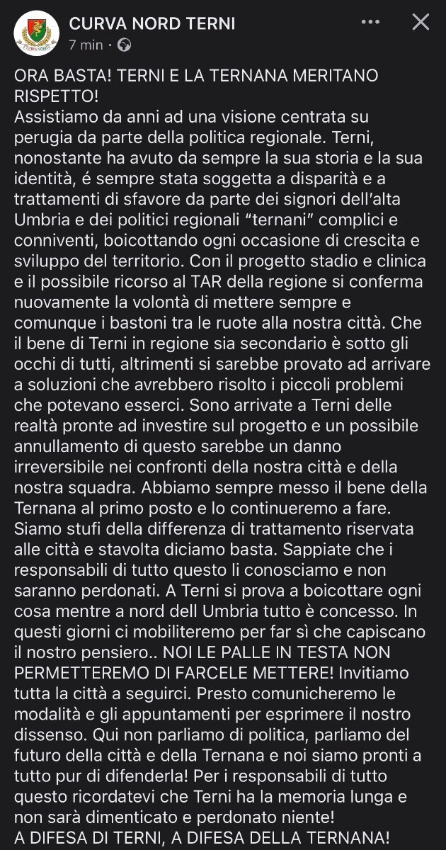 La Ternana con il fallimento di questo progetto non ha più futuro…meglio sparire. Dopo l’anno della mancata promozione in A questa è la pietra tombale sulle nostre fere. Il tutto è stato affossato da chi, concittadini (anche no) e perugini, firma però delibere per far erogare alle cliniche private perugine prestazioni in eccedenza rispetto ai tetti di spesa.