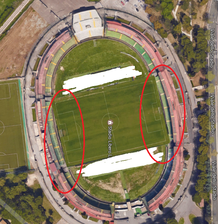 al di là dell'idiozia di girare il campo (orientato) e di lasciare i distinti che comunque sono strutture vecchie e obsolete, è proprio il campo che, girato, non c'entrerebbe mai. non c'è lo spazio. per di più i distinti, come le curve, sono incurvati, non sono dritti.