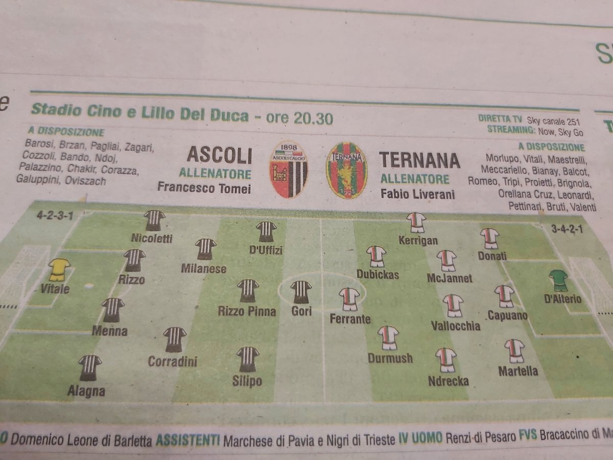 TERNANA (3-4-1-2): D’Alterio, Donati, Capuano, Maestrelli, Bianay, Proietti, Vallocchia, Ndrecka, Romeo, Pettinari, Dubickas. A disposizione Vitali, Morlupo, Tripi, McJannet, Leonardi, Brignola, Meccariello, Kerrigan, Ferrante, Orellana, Valenti, Bruti, Durmush. All. Liverani
